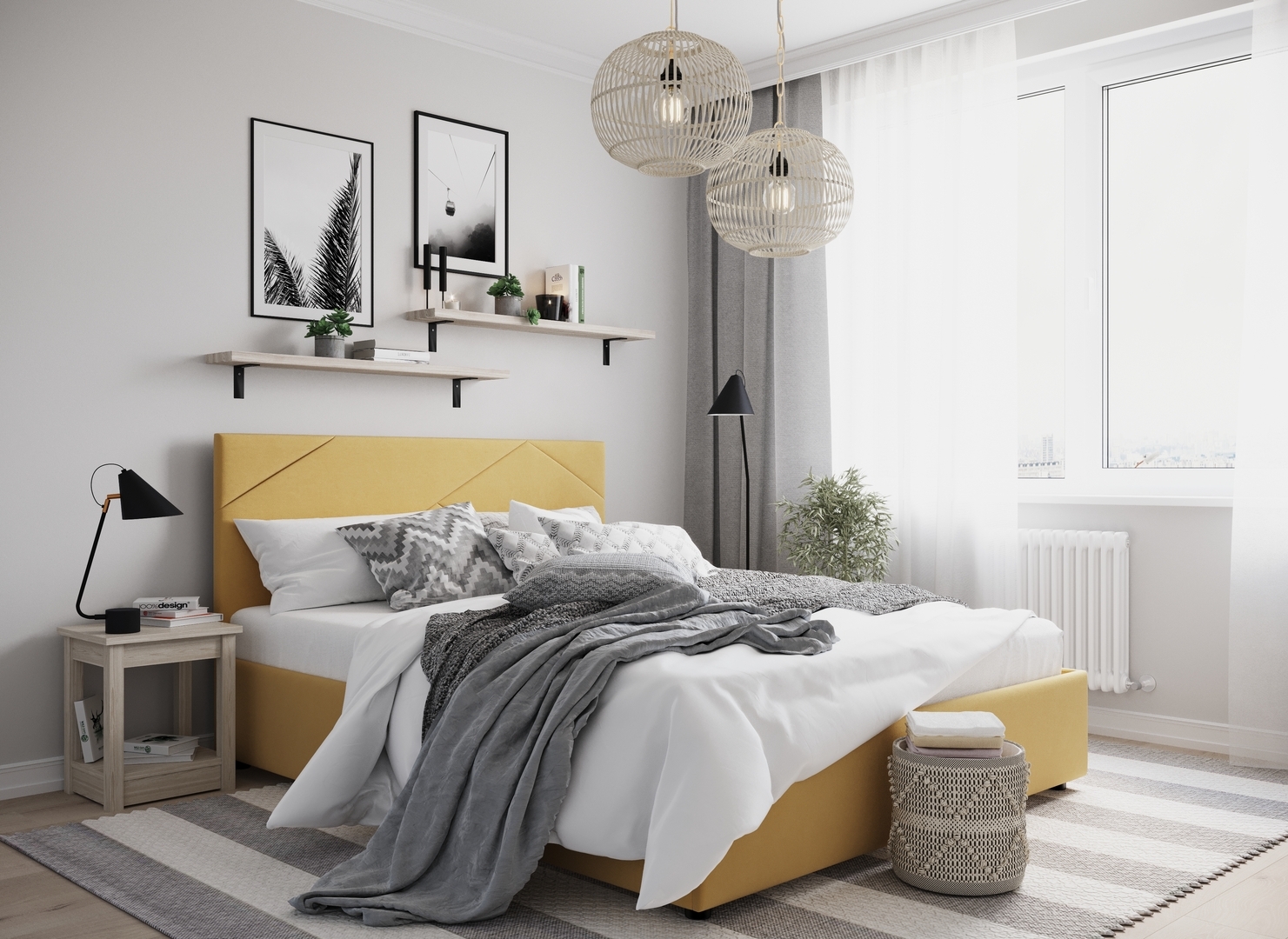 Создать гармоничный интерьер и завершить образ спальни помогут дополнительные аксессуары, например: тумбы, банкетки, подушки.