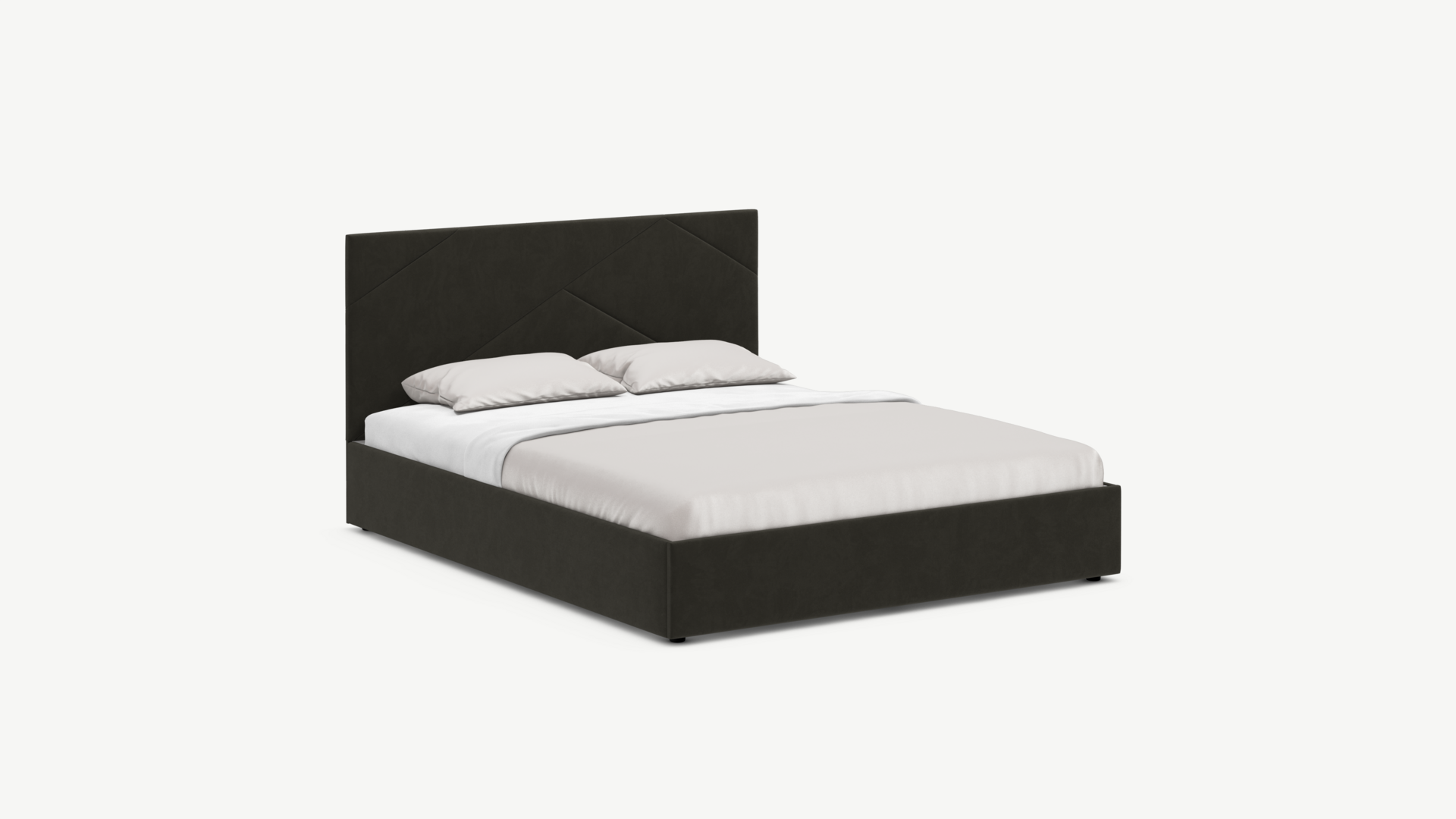 MOON FAMILY 1257 привлекает внимание оригинальным исполнением: широкие полосы ткани эффектно пересекают периметр изголовья, создавая на нем графический орнамент. Элегантным и практичным акцентом служат скрытые карманы, расположенные по его углам. Лаконичные формы объемных царг создают единый гармоничный образ и фокусируют внимание на центральном текстурном элементе кровати.