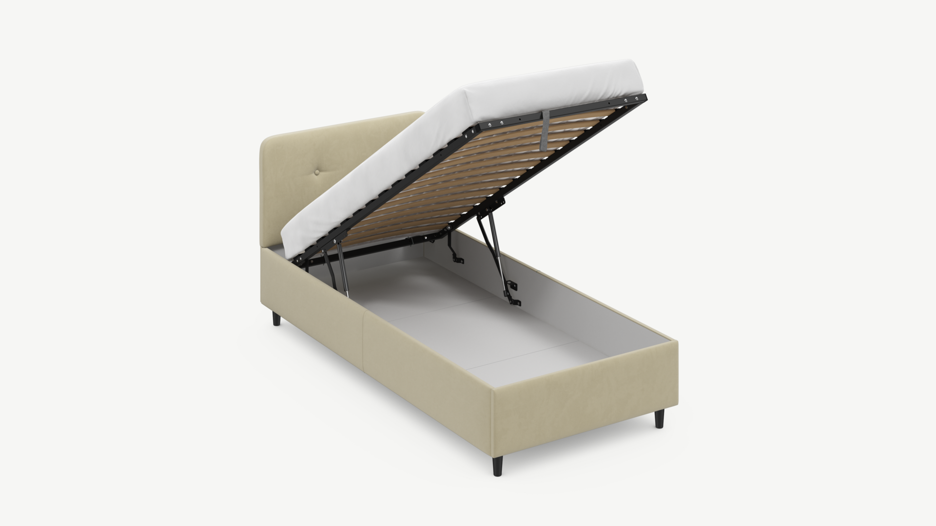 • Скрытая под основанием вместительная емкость без внутренних перегородок позволяет использовать всю площадь подкроватного пространства для хранения вещей.