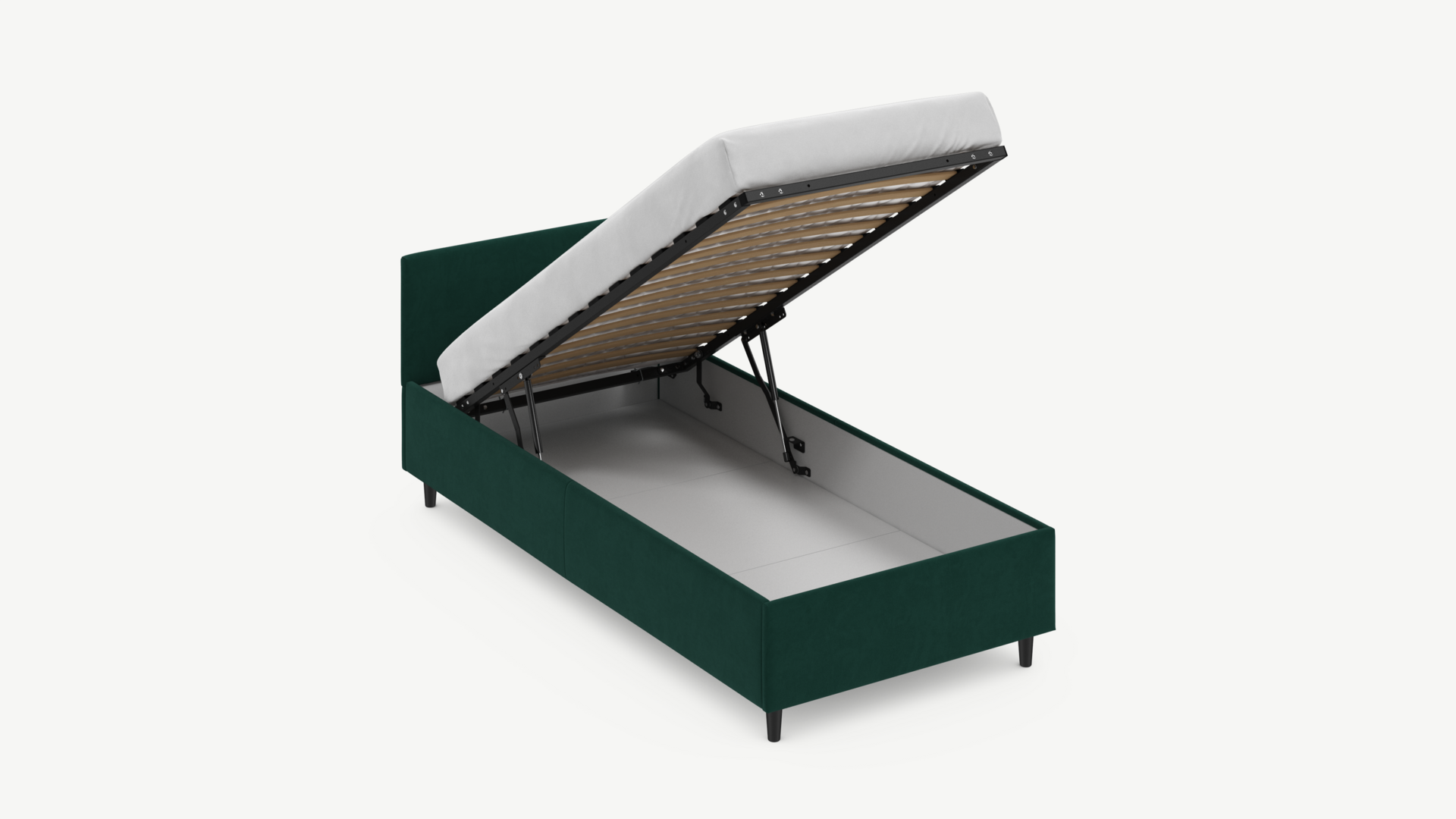 Вместительная емкость под кроватью без внутренних перегородок позволяет использовать для хранения вещей 100% пространства.