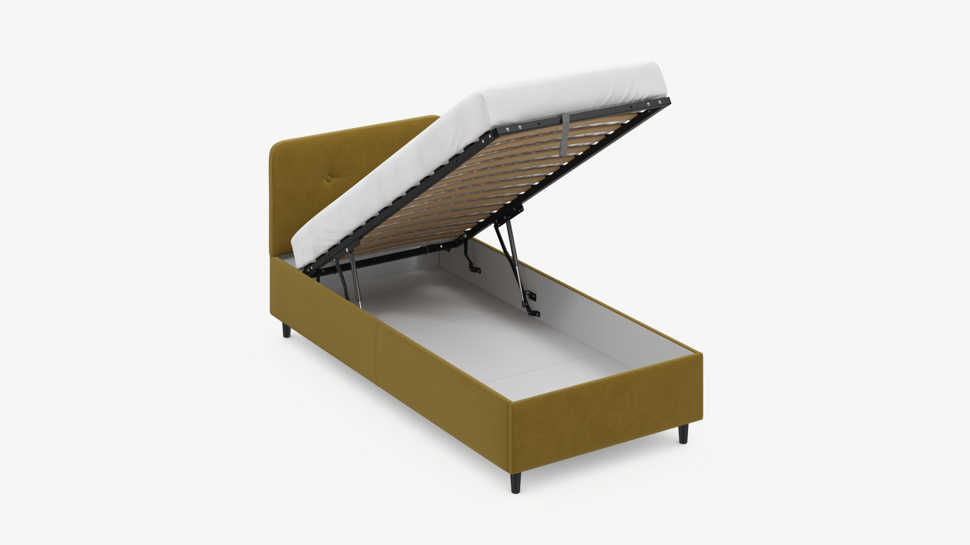 • Скрытая под основанием вместительная емкость без внутренних перегородок позволяет использовать всю площадь подкроватного пространства для хранения вещей.