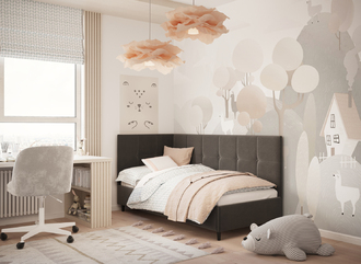Угловая односпальная кровать MOON FAMILY 1261 с мягкой спинкой и изголовьем создаст в Вашей спальне ощущение уюта. Крупная квадратная стежка привносит в интерьер графических акцентов, а вставка из пуговиц наполняет пространство ощущением домашнего тепла.