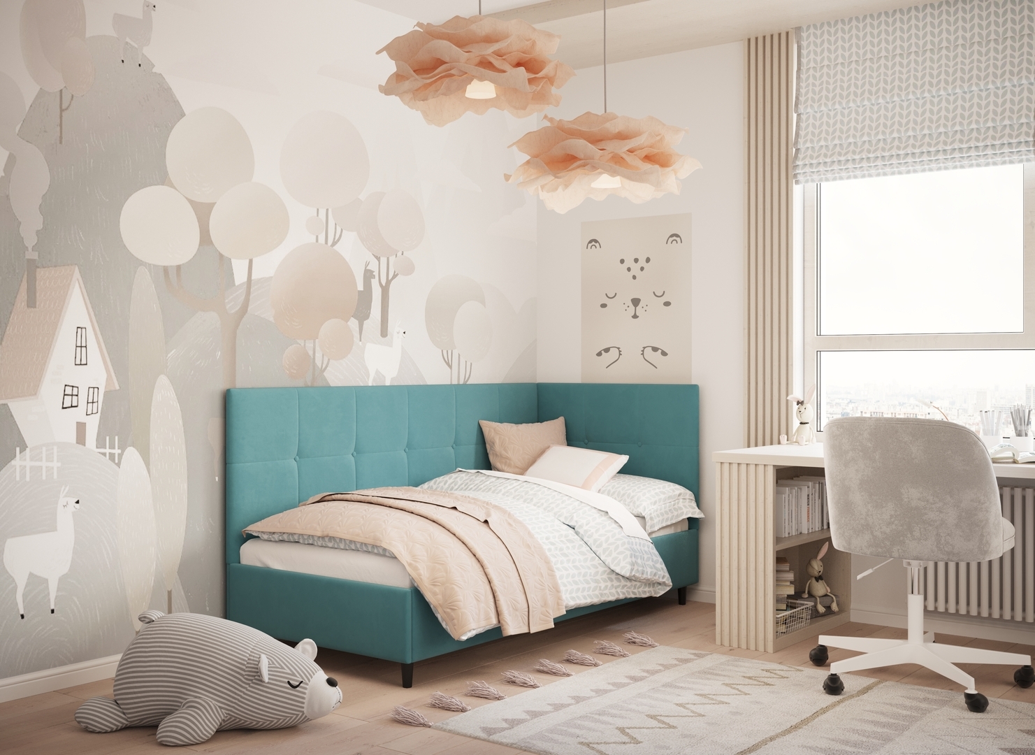 MOON FAMILY 1261 объединяет функциональность и стиль, создавая гармоничное пространство для отдыха и творчества. Кровать доступна в левостороннем и правостороннем исполнении, что позволяет легко адаптировать ее под любые интерьерные особенности.