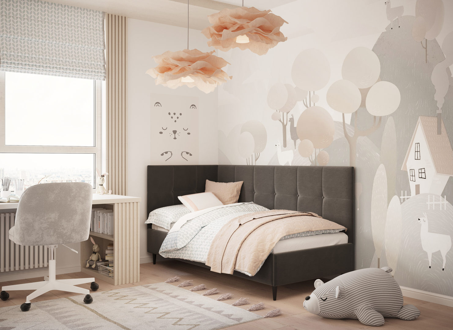 MOON FAMILY 1261 объединяет функциональность и стиль, создавая гармоничное пространство для отдыха и творчества. Кровать доступна в левостороннем и правостороннем исполнении, что позволяет легко адаптировать ее под любые интерьерные особенности.