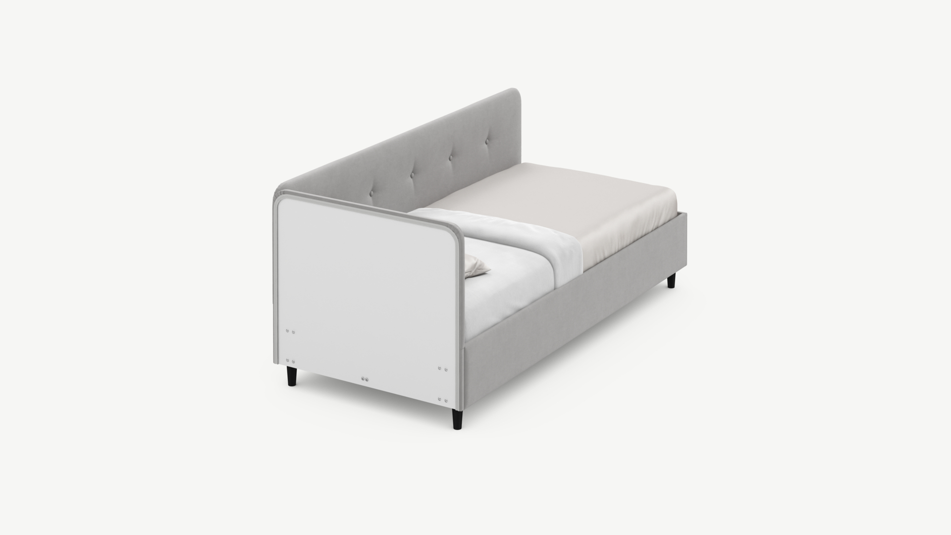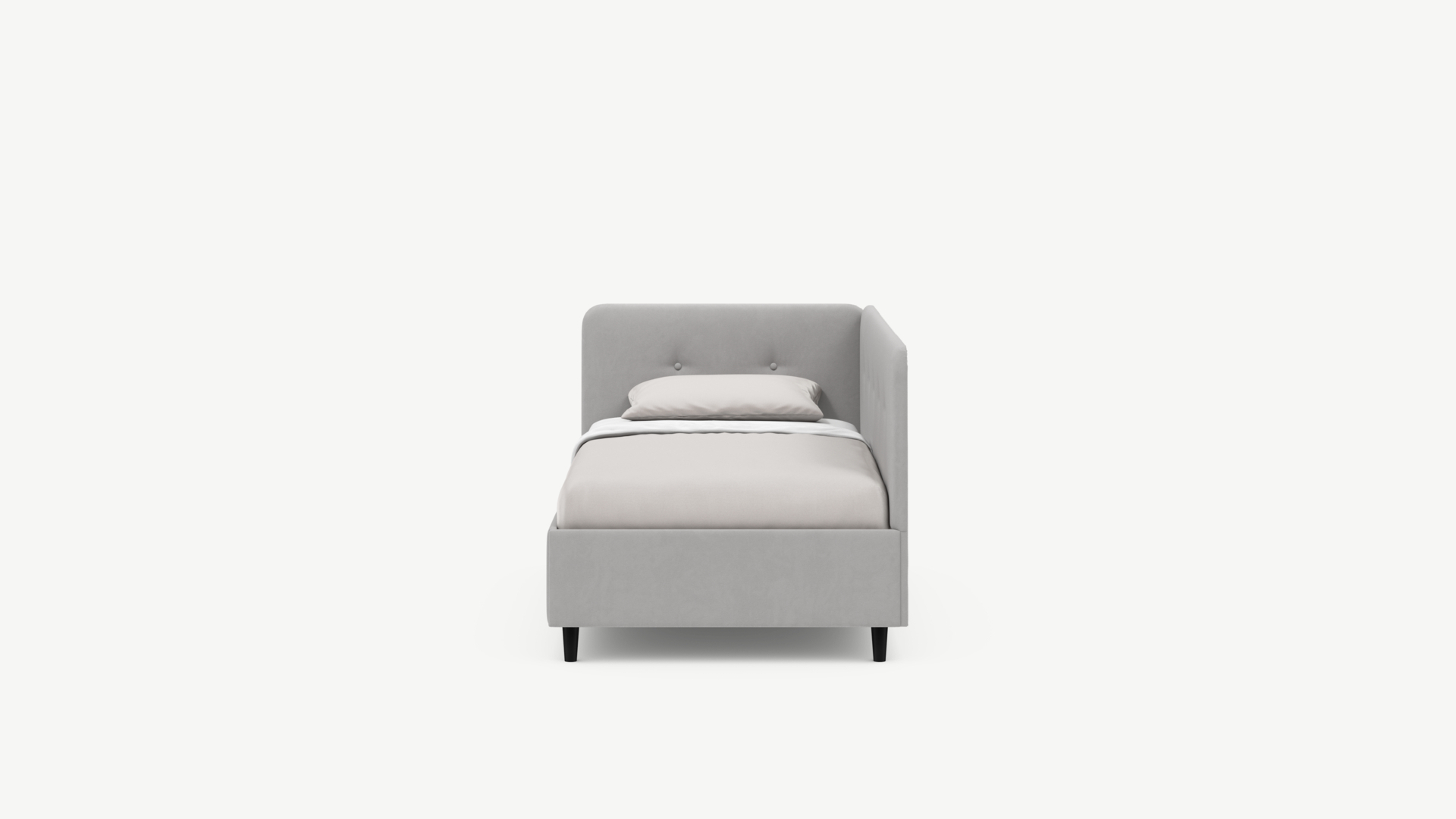 Угловая односпальная кровать MOON FAMILY 1253 с мягкой спинкой и изголовьем обладает округлыми формами, привносящими в интерьер нотки нежности. Изголовье, украшенное пуговицами, добавляет окружающему пространству шарм и уют. Высокие опоры придают кровати визуальной легкости, а также обеспечивают удобство во время уборки.