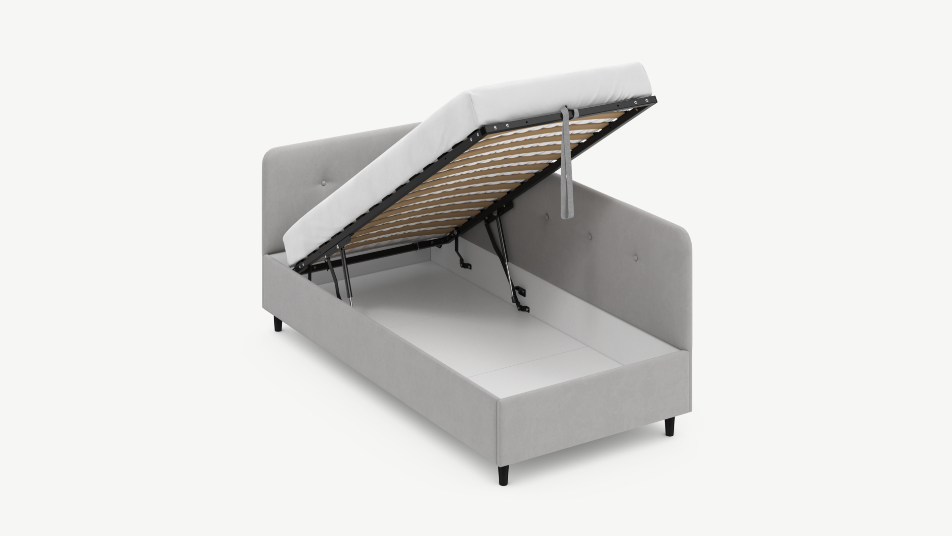 • Скрытая под основанием вместительная емкость без внутренних перегородок позволяет использовать всю площадь подкроватного пространства для хранения вещей.