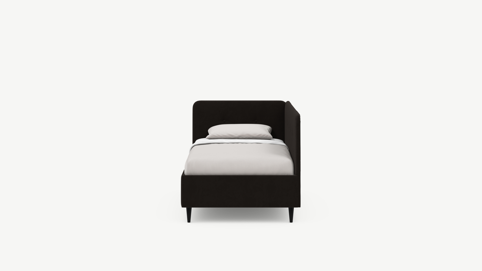 Угловая односпальная кровать MOON FAMILY 1253 с мягкой спинкой и изголовьем обладает округлыми формами, привносящими в интерьер нотки нежности. Изголовье, украшенное пуговицами, добавляет окружающему пространству шарм и уют. Высокие опоры придают кровати визуальной легкости, а также обеспечивают удобство во время уборки.