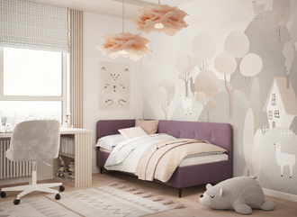 Угловая односпальная кровать MOON FAMILY 1253 с мягкой спинкой и изголовьем обладает округлыми формами, привносящими в интерьер нотки нежности. Изголовье, украшенное пуговицами, добавляет окружающему пространству шарм и уют. Высокие опоры придают кровати визуальной легкости, а также обеспечивают удобство во время уборки.