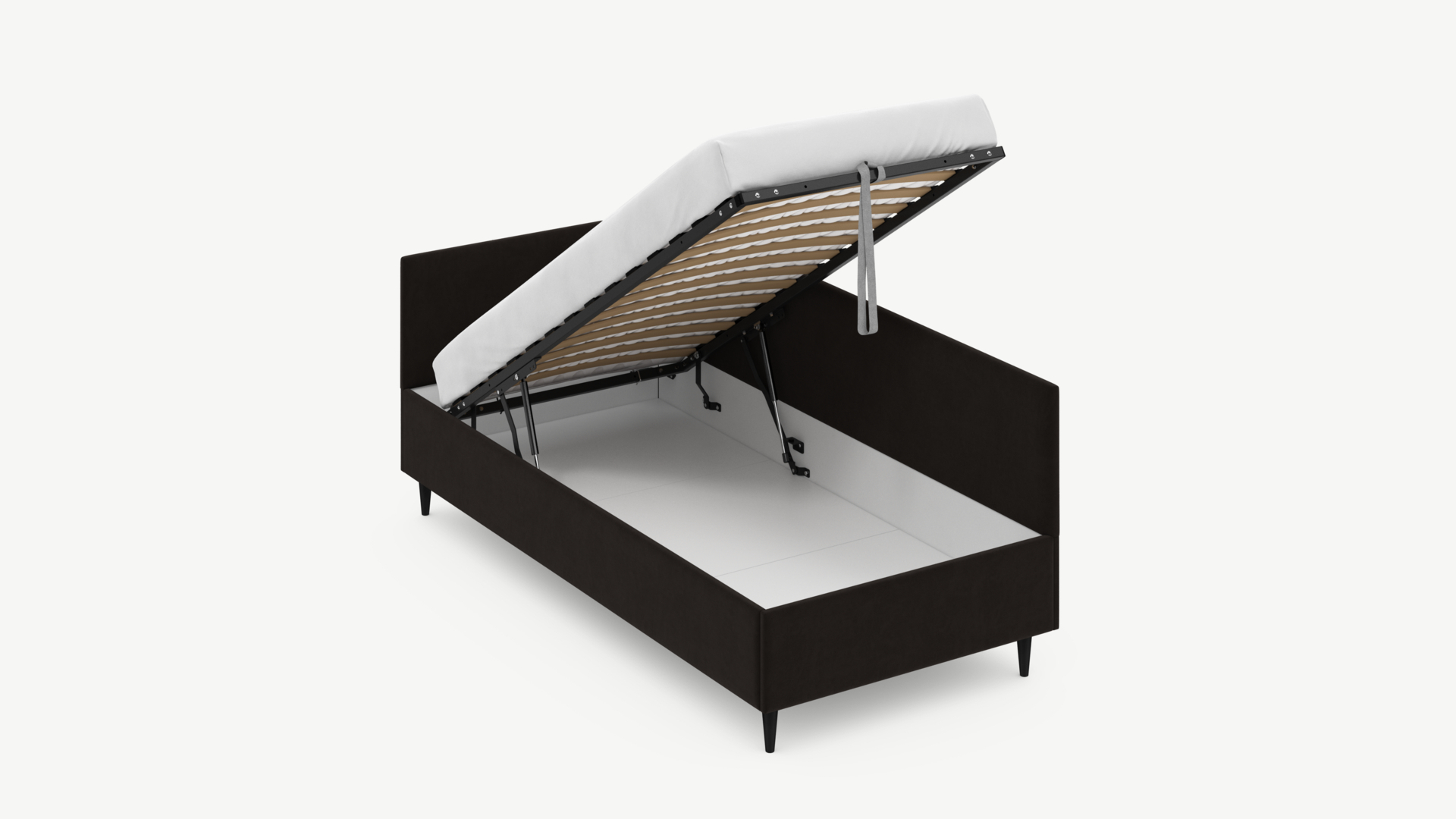 • Регулируемый подъемный механизм имеет два положения установки газовых амортизаторов в зависимости от веса матраса. Это дает возможность оптимально подстраивать угол подъема основания, а также плавно и бесшумно поднимать и опускать спальное место.
