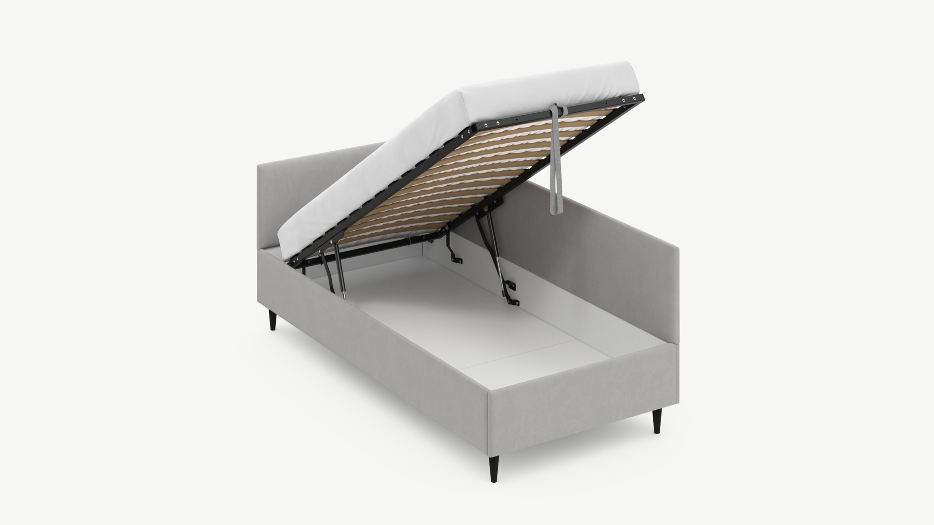• Регулируемый подъемный механизм имеет два положения установки газовых амортизаторов в зависимости от веса матраса. Это дает возможность оптимально подстраивать угол подъема основания, а также плавно и бесшумно поднимать и опускать спальное место.