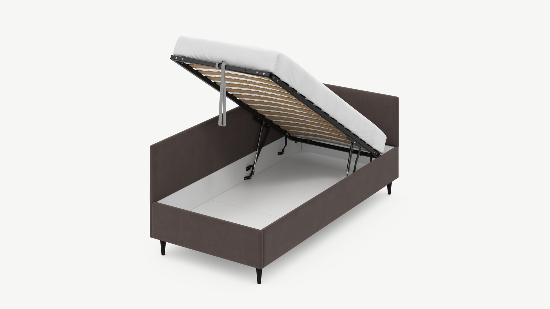 • Регулируемый подъемный механизм имеет два положения установки газовых амортизаторов в зависимости от веса матраса. Это дает возможность оптимально подстраивать угол подъема основания, а также плавно и бесшумно поднимать и опускать спальное место.