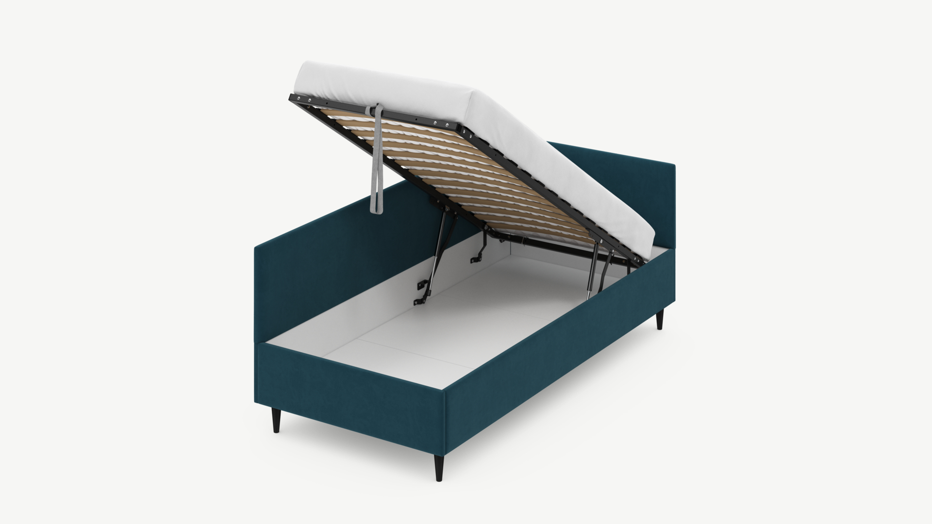 • Скрытая под основанием вместительная емкость без внутренних перегородок позволяет использовать всю площадь подкроватного пространства для хранения вещей.