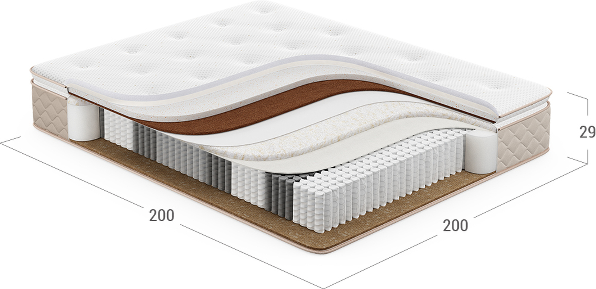 Надежно изолирует комфортные слои от соприкосновения с пружинным блоком и защищает материалы наполнения матраса от износа.